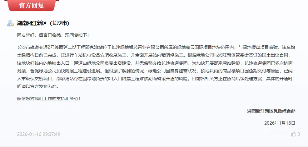但根据了解到的情况,绿地公司因自身经营状况,该地块内的商品楼项目因延期交付等原因,已纳入市级保交楼项目,邵家湾站存在因绿地负责的出入口附属工程难按期而暂缓开通的风险。目前各相关方正在协商后续处理方案,具体的开通时间请以官方发布为准。”