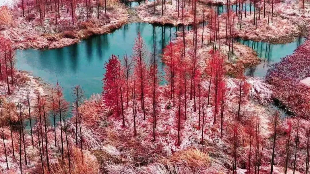 岛上的杉树,像是被大自然精心装扮过,原本火红的枝叶,此刻被白雪点缀,红白相间,煞是好看。