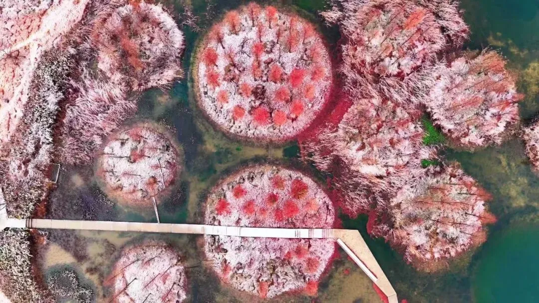 当雪花纷纷扬扬地飘落,大泽湖近自然湿地公园瞬间换了模样,美得如梦如幻。