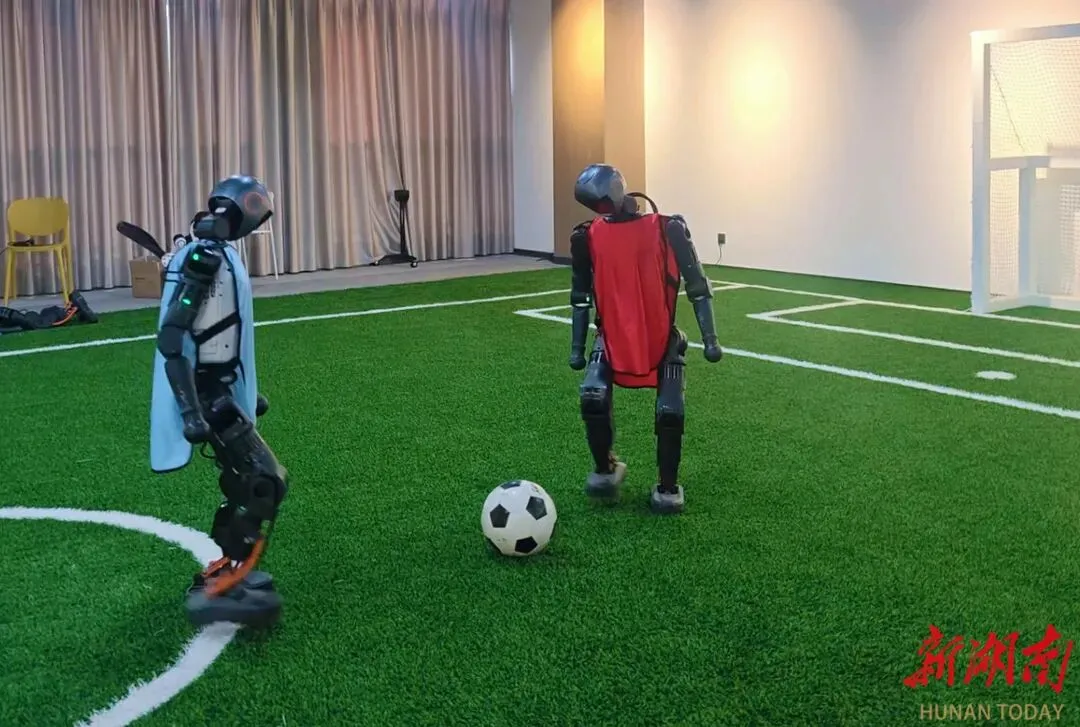 1月16日,湖南具身智能创新中心,人形机器人进行足球对抗训练。湖南日报全媒体记者 范远志 摄