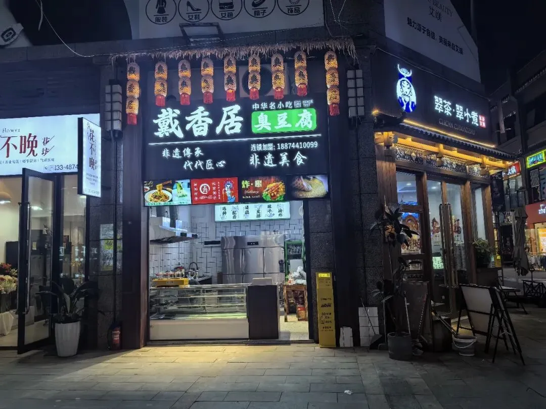 戴香居张家界首店选址核心美食腹地——天门中央广场,具体位于永定区崇文街道南正居委会解放路3号栋1S09-3铺位,紧邻南门美食街(古雍城繁华核心,汇聚各类风味小吃),步行可达天门山景区周边,距离新码头夜市、十字街步行街等热门打卡地也十分便捷。不管是爬完天门山的能量补给、逛夜市的解馋搭配,还是本地人的日常加餐、朋友聚会的开胃小食,来一份戴香居臭豆腐,都是逛吃张家界的最优解!周边更有土家特色美食店、民俗购物街区环绕,逛吃一站式拉满。