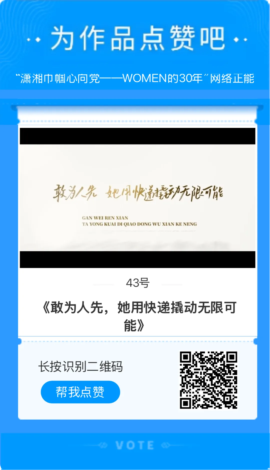 日前,征集与初评阶段已顺利结束。经过自荐与层层筛选,80组视频作品、50组影像作品、50篇征文作品及31个达人账号入围下一轮比选,并进行网络点赞。从1月21日起,候选作品在湖南省妇联官方微信湘妹子上接受全面公开点赞!快来为你心目中的优秀作品点赞吧。