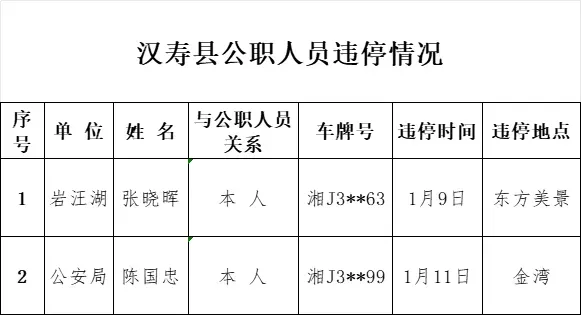 按照汉寿县委、县政府建设社会主义现代化新汉寿的目标要求,当前,汉寿人民正齐心协力投身于综合秩序整治行动中,城市总体文明风貌得到明显提升。但仍有少数公职人员未起到表率作用,未在规定区域内停车。为巩固文明城市创建成果、持续营造良好的城市环境,县文明办将持续通报公职人员和单位车辆违规停放情况,望广大市民和公职人员引以为戒。现将2026年1月1日-15日公职人员和单位车辆“违章停车”情况通报如下。