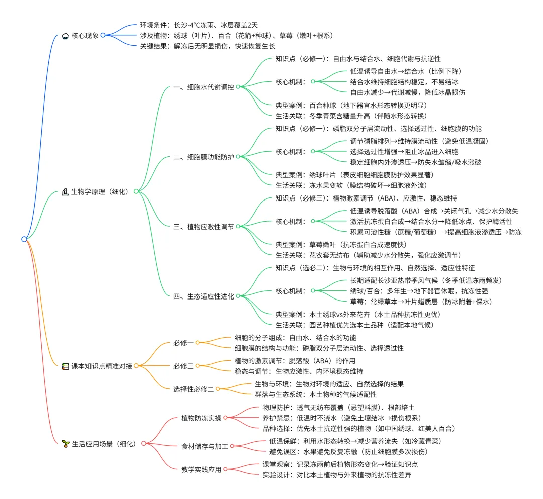 百合的种球、草莓的根系在冰封后完好无损,正是抗冻蛋白和可溶性糖共同作用的结果 —— 这对应了高中生物 “植物通过激素调节和物质合成,维持自身稳态以适应环境” 的核心知识点。