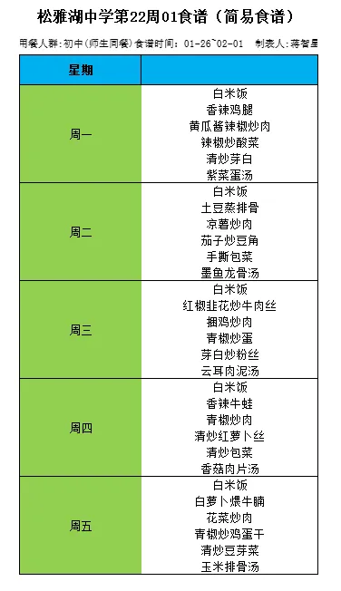【每周食谱】| 长沙市松雅湖中学2025年下学期第22周食谱