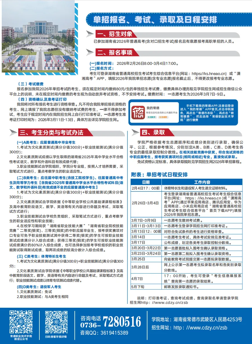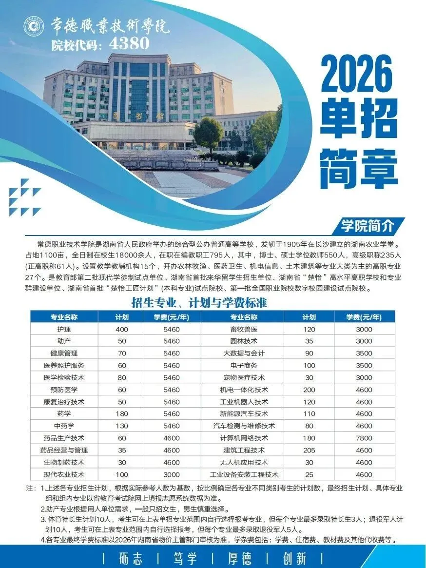 常德职业技术学院是湖南省人民政府举办的综合型公办普通高等学校,发轫于1905年在长沙建立的湖南农业学堂。占地1100亩,全日制在校生18000余人,在职在编教职工795人,其中,博士、硕士学位教师550人,高级职称235人(正高职称61人)。设置教学教辅机构15个,开办农林牧渔、医药卫生、机电信息、土木建筑等专业大类为主的高职专业27个。是教育部第二批现代学徒制试点单位、湖南省首批来华留学生招生单位、湖南省“楚怡”高水平高职学校和专业群建设单位、湖南省首批“楚怡工匠计划”(本科专业)试点院校、第一批全国职业院校数字校园建设试点院校。