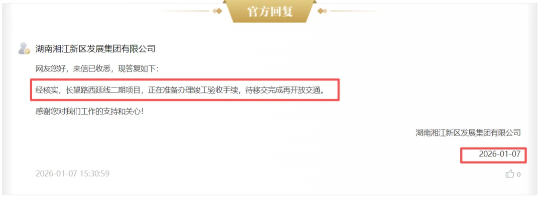 湖南湘江新区发展集团有限公司在1月7日的回复中确认,该项目"正在准备办理竣工验收手续,待移交完成再开放交通"。
