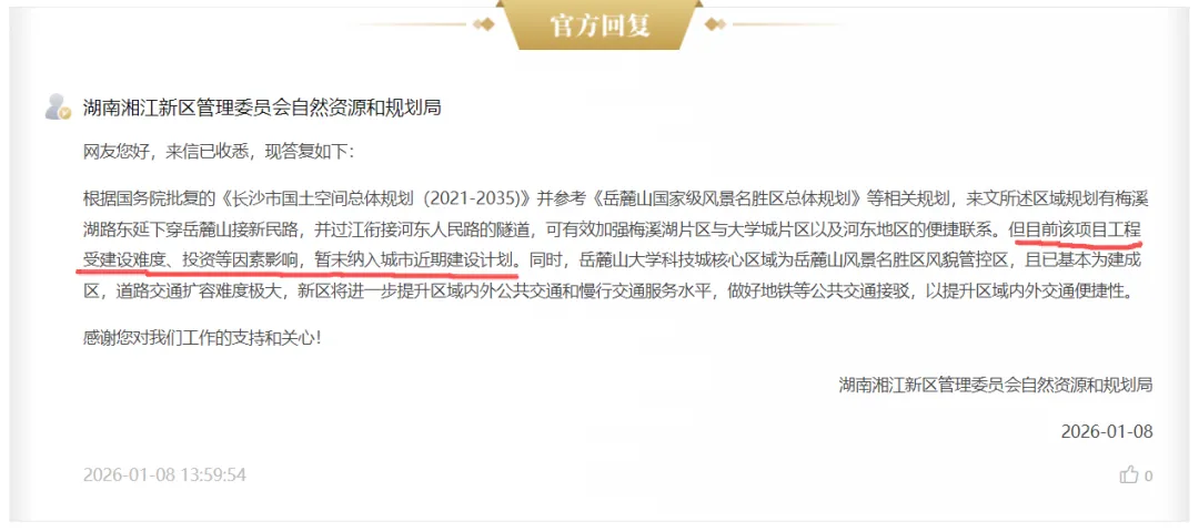 湖南湘江新区管理委员会自然资源和规划局在1月8日的回复中表示,虽然规划有梅溪湖路东延下穿岳麓山接新民路,并过江衔接河东人民路的隧道,但"受建设难度、投资等因素影响,暂未纳入城市近期建设计划"。