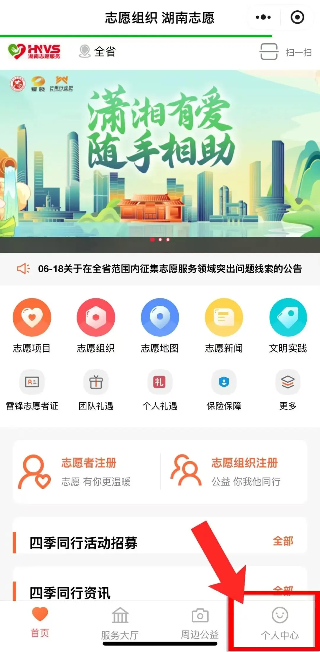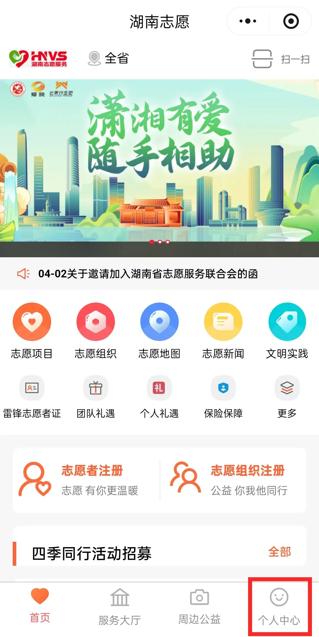 2.打开“湖南志愿”微信小程序点击右下角“个人中心”进行志愿者注册并登录。