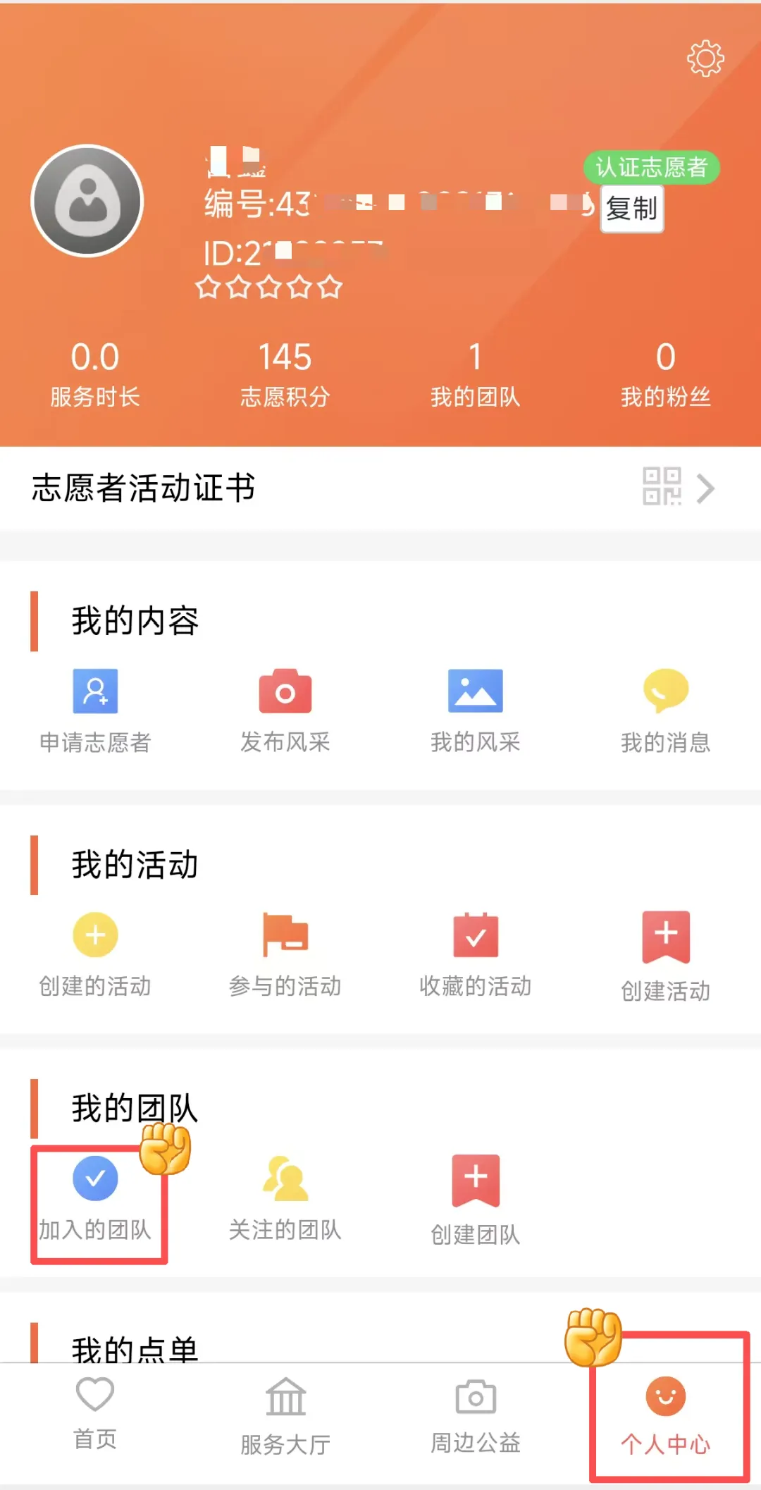 进入个人中心后点击“志愿者活动证书”可获取志愿服务证书。