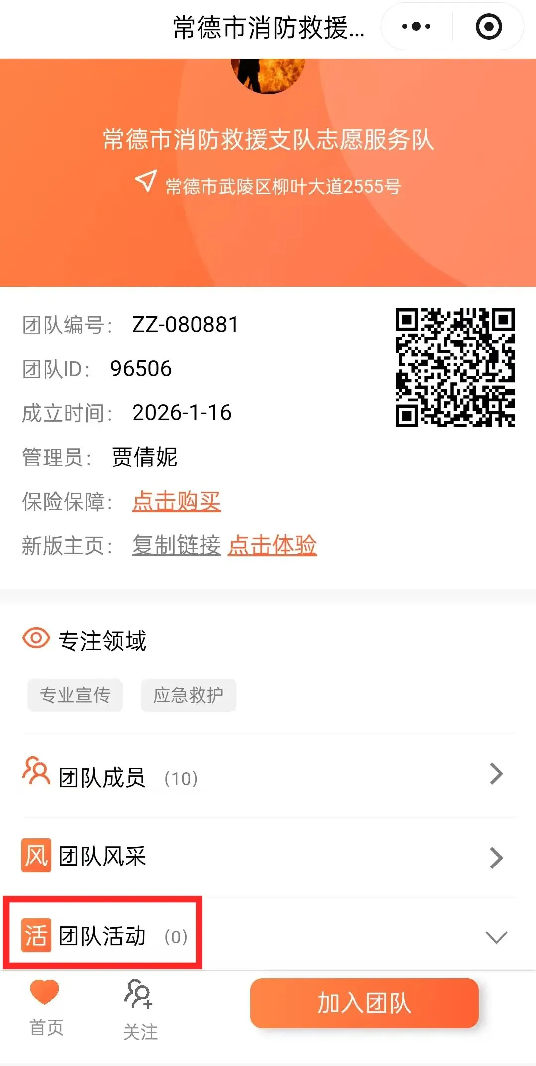 6.点击“常德市消防救援支队志愿服务队”,进入中心页面后点击右下角“加入团队”等待审核人员同意即可。
