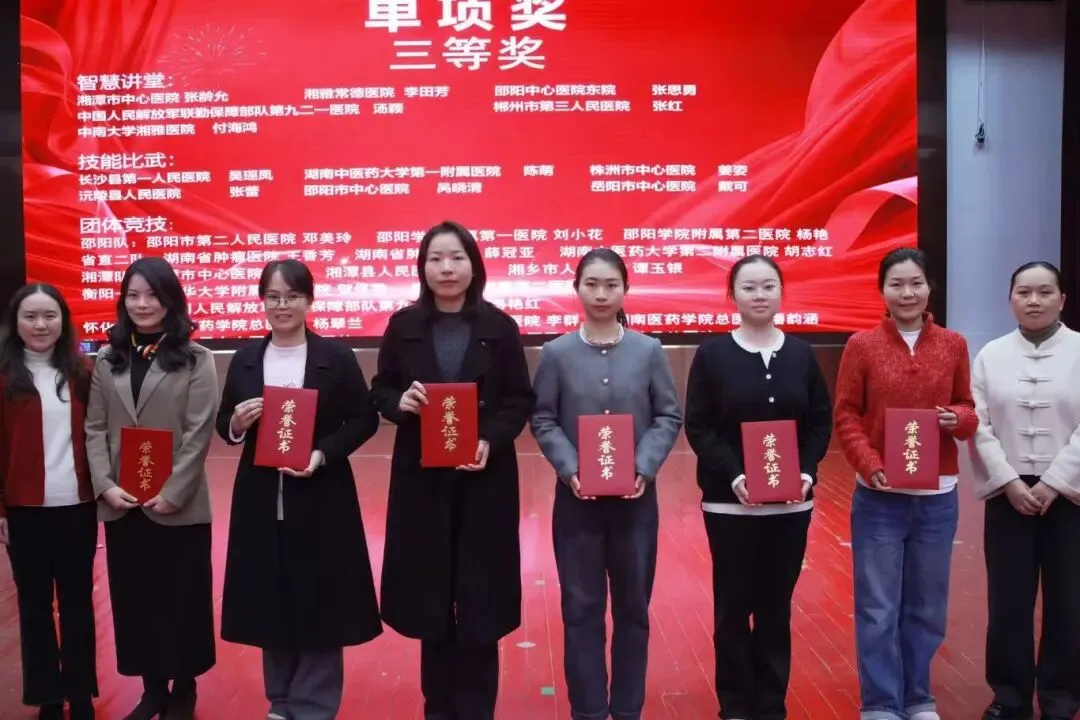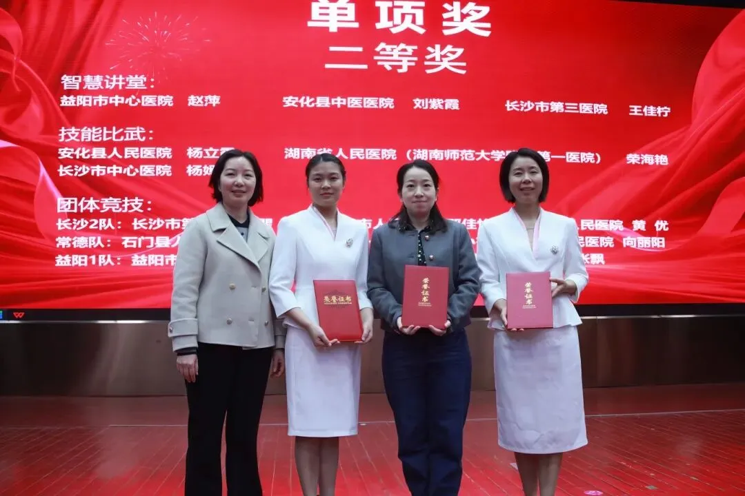 在团体竞技项目中,由常德市第一人民医院的徐小杰,石门县人民医院的向丽芳、莫兰三名队员组成参赛团队。比赛过程中,三位队员配合默契、应对沉着,充分展现了良好的专业素养和团队协作能力,最终荣获湖南省二等奖。
