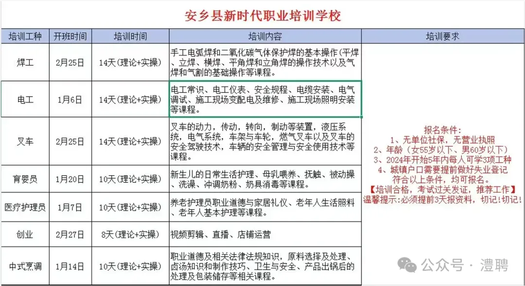 开设:人工智能训练师、电商直播班、电脑班、电工、焊工、叉车、创业培训...