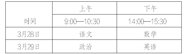1.考试科目。文化考试科目为语文、数学、政治、英语四科,每科满分为150分,四科满分为600分,使用国家通用语言文字作答。