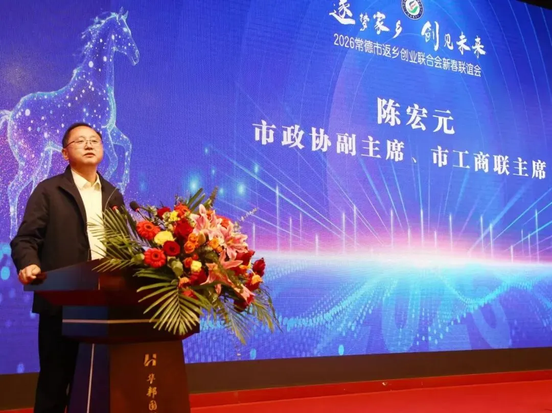 桑梓情浓聚一堂,创业同心赴新程。1月23日,2026常德市返乡创业联合会新春联谊会现场暖意流淌、欢歌盈堂。市政协副主席、市工商联主席、市总商会会长陈宏元出席会议并讲话。市就业服务中心、市人才集团、鼎城区人民政府、桃源县人民政府、鼎城区政协、鼎城区委统战部、桃源县残联、鼎城区文化旅游广电体育局、桃源县就业服务中心等相关领导,湘超常德队员代表、兄弟商协会负责人、媒体记者、特邀嘉宾、桃源受助学生及家长,返乡创业联合会全体会员欢聚一堂,共话美好未来。