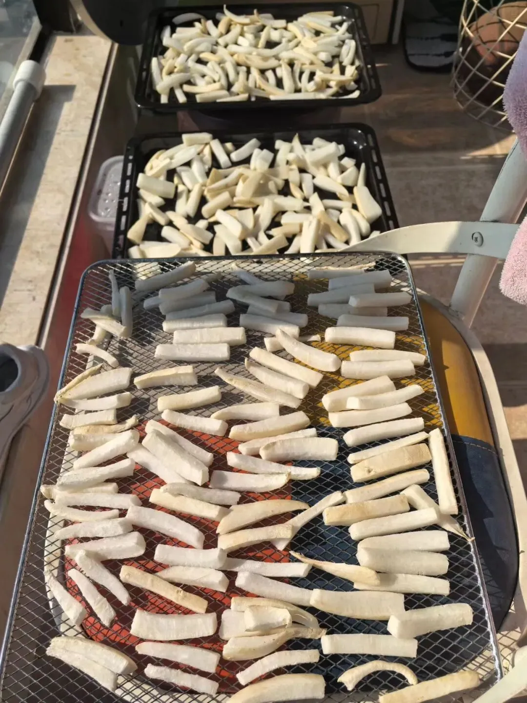 没有老家的晾晒道场,也没有上下透气的竹箅,在城市里逼仄、遮风避雨的全封闭的阳台上,我找出蒸箱烤箱洗菜盛菜的各种托盘和塑料篮筐,摆阵开来。