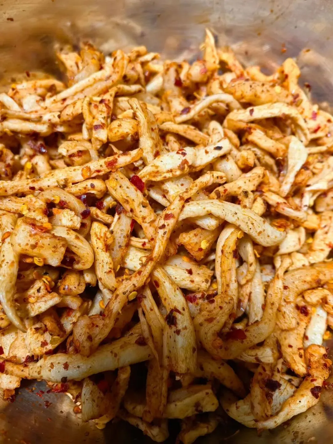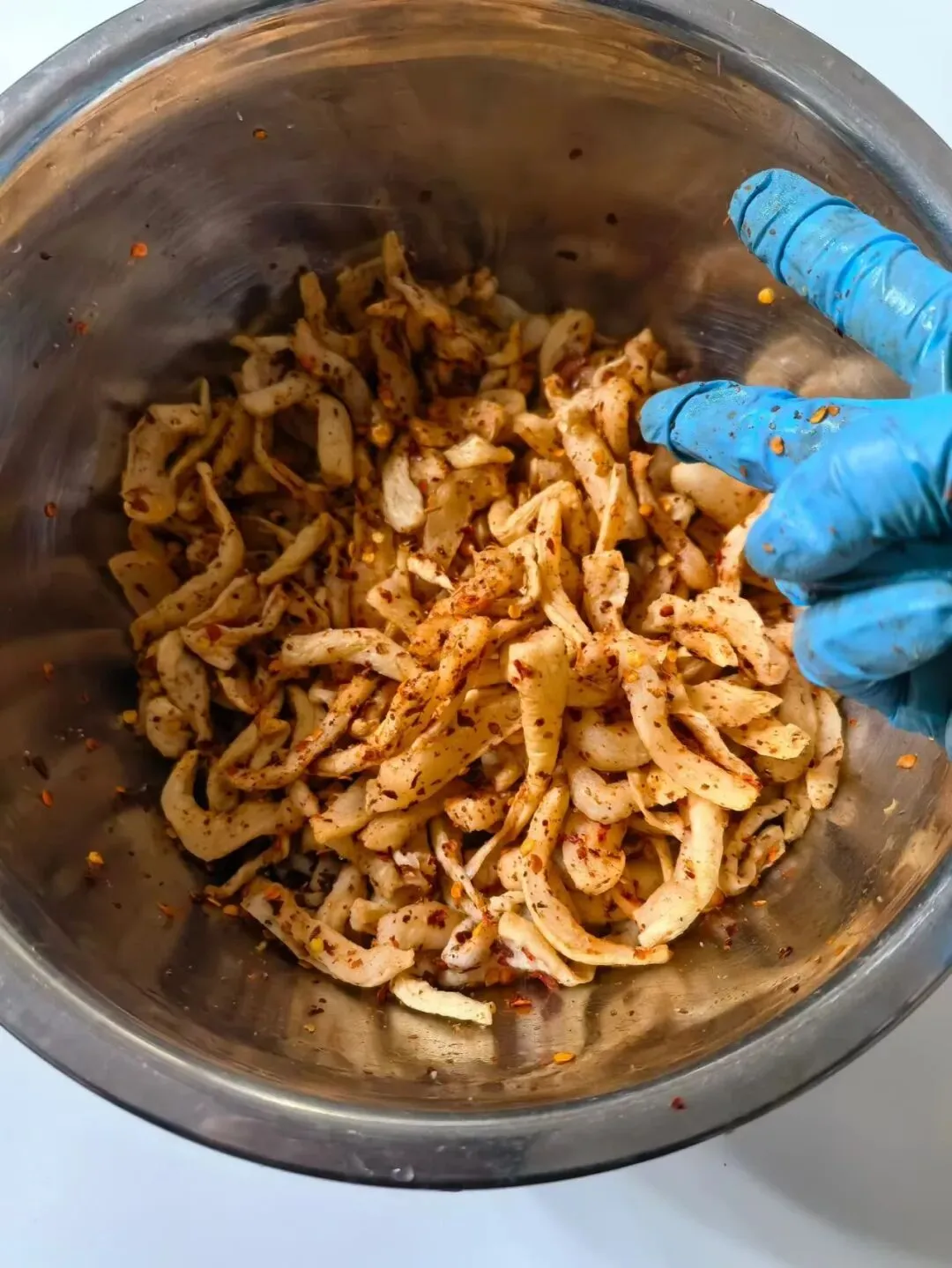 腌萝卜干的关键步骤是拌调料。调味料只有粗盐、辣椒粉、花椒粉。拌料过程中,母亲有个关键动作--揉搓。拿出无油无水的大盆,萝卜干倒进去,左手拿着盐包,右手拿着香料粉包。左手抖抖,右手抖抖,左右手抖动的频率和力度各不相同。盐粒簌簌,粉料轻柔,一双粗糙的大手掌在盆里用力揉搓。揉搓后,再次静置,让调料开始深入萝卜的肌理。这个工序,应该是腌菜物理入味的关键。