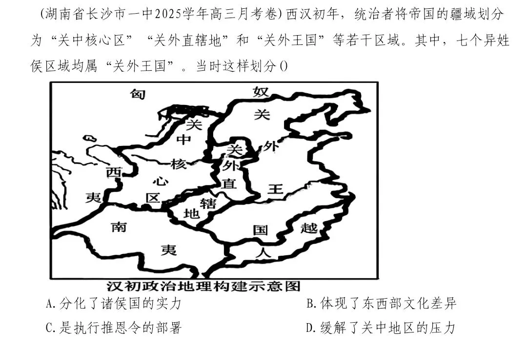 官方答案是 B(文化差异),理由是:秦朝的迅速灭亡,与项羽等六国旧贵族的反抗,证明了东方地区封建残余势力依然强大;而关中、巴蜀作为秦旧土,中央集权基础稳固。汉初吸取秦亡教训,承认并尊重东西部政治土壤的差异:在西部延续集权,在东部顺应旧俗实行分封。这种“因俗而治”的策略正是郡国并行制的由来。故B项表述正确。但经过深思熟虑, 我仍然选择 D(缓解压力)。