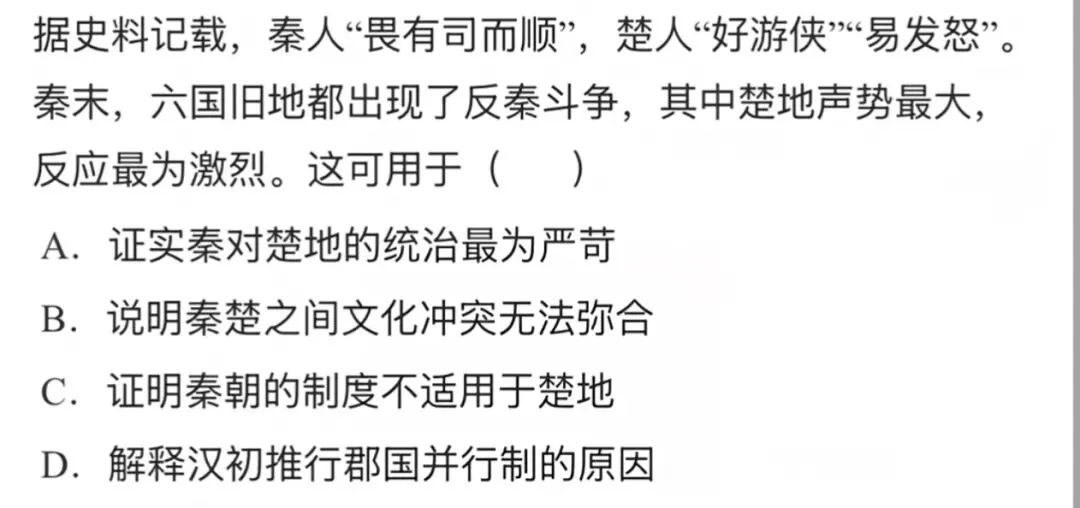 的画虎不成反类犬,若要得出 B 选项(文化差异),学生既做过 24 年真题,还必须跳过地图信息,预设一个“汉初顺应东方文化”的结论强行套用;而得出 D 选项(缓解压力),只需分析地图上的防线分布与诸侯位置即可自然推导。一道客观题,如果无视地图上最显眼的内务、国防特征,非要考察地图背面看不见的文化动机,就便违背了“论从史出”的基本原则。这种命题方式不是在考历史思维,而是在考学生是否能猜中出题人的主观意图。