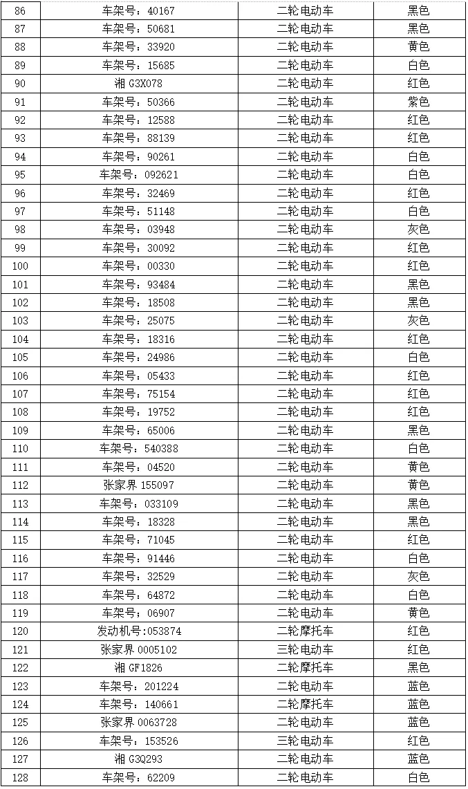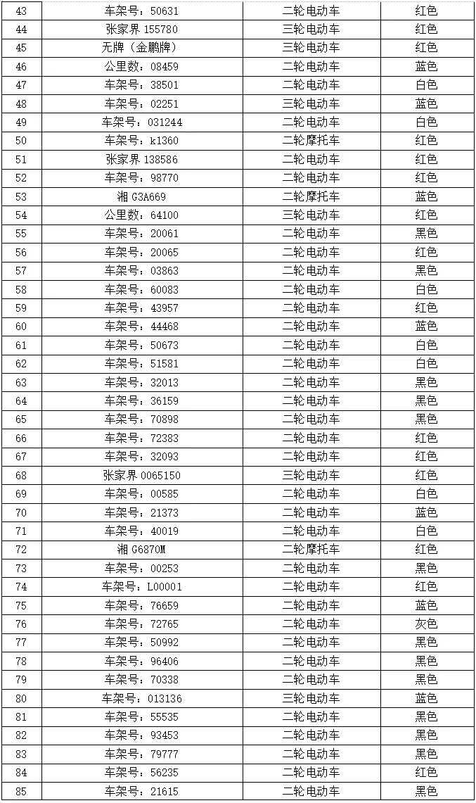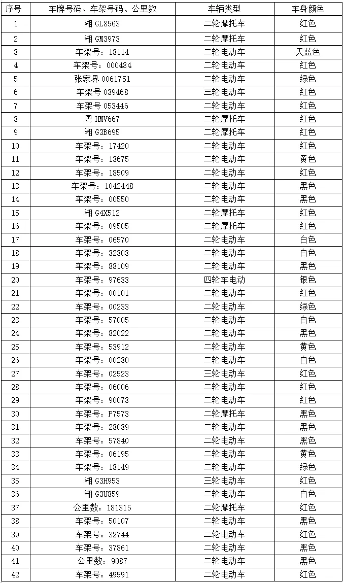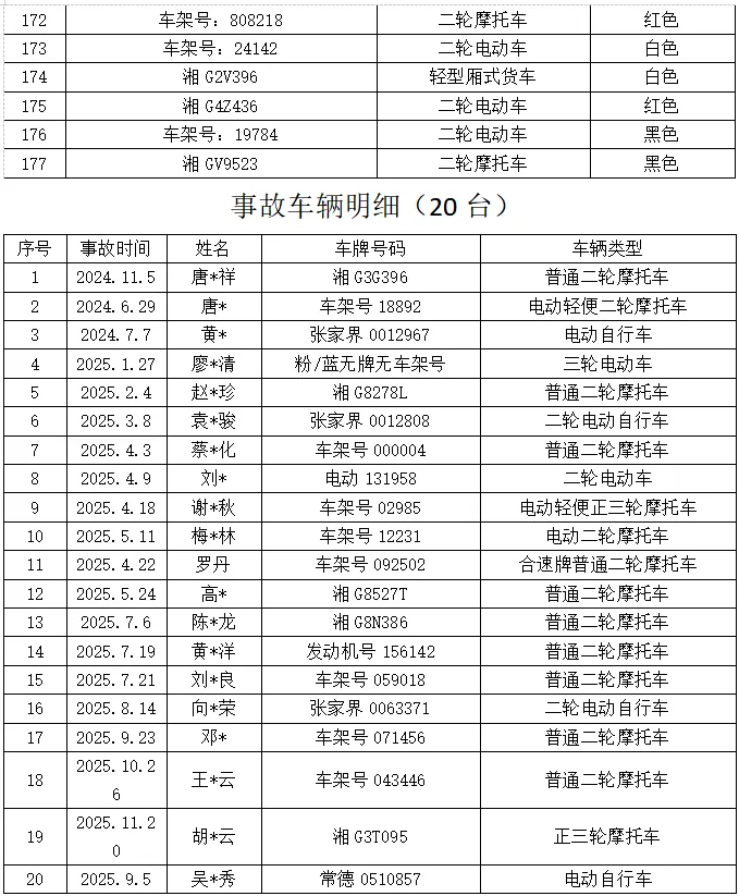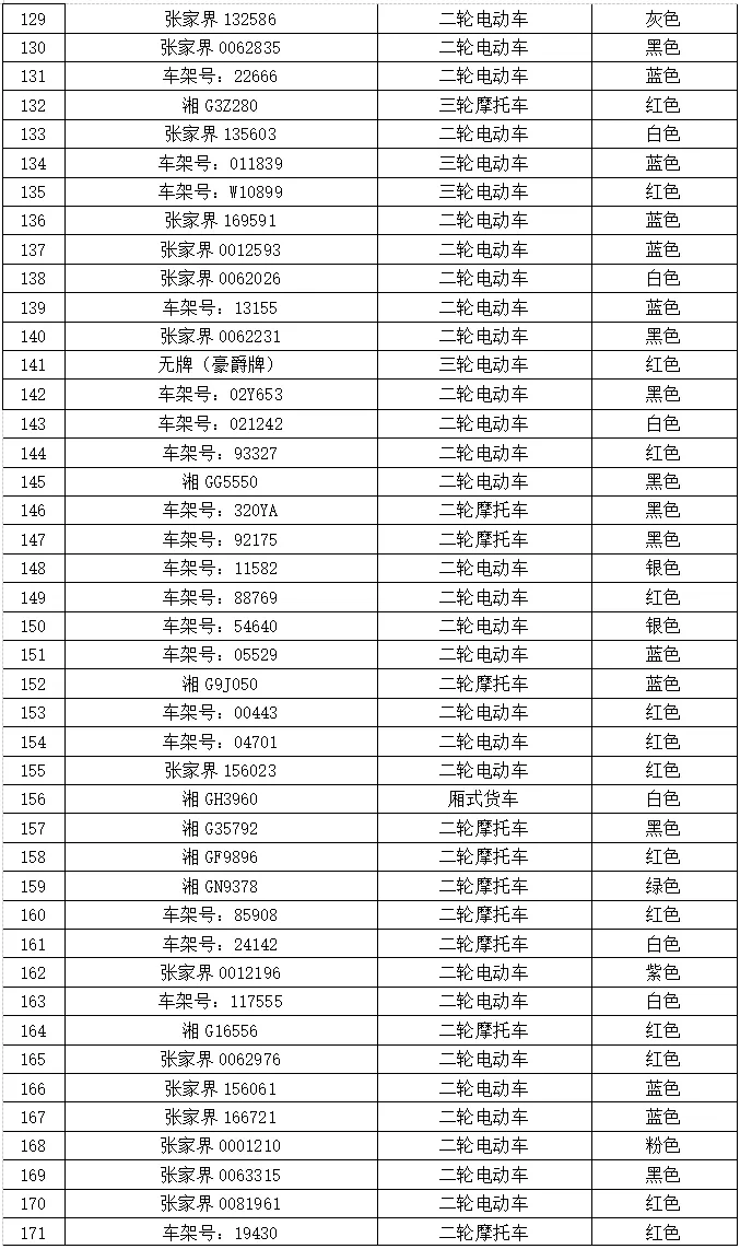 本次公告涉及扣留车辆(无证、无牌、连续三个周期未年检或超过使用年限的二、三轮摩托车、小型汽车等)共计197辆,请下列车辆所有人(驾驶人、管理人)自本公告之日起三个月内,持本人身份证明、车辆合法证明(行驶证、登记证书等)、车辆扣留凭证,到张家界市公安局交通管理支队直属二大队教育处罚中心接受处理并办理车辆领取手续。当事人逾期未前来接受处理的,我大队将依法对扣留车辆进行拍卖、拆解或者移交财政部门处理。对拼装或者已达报废标准的机动车,一律依法予以收缴并强制报废。