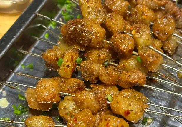 晚上留给烧烤,岳阳烧烤在湖南是“扛把子”。重点推荐岳阳牛油小串。不是那种干巴巴的烤,而是带“油”的艺术。选用牛胸口的油,切得指甲盖大小,猛火快烤,撒上葱花孜然。一口咬下去,牛油在嘴里“噗”地爆开,奶香味瞬间裹满舌头,不腻,只觉得香得迷糊,配上一瓶冰啤酒,整个人都舒展了。