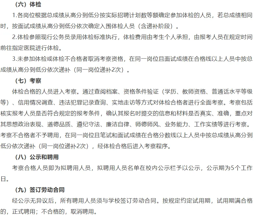 面试成绩当场公布(成绩四舍五入,保留小数点后两位)。面试满分为100分,设置合格分数线80分(含),低于合格线者不进入体检程序。