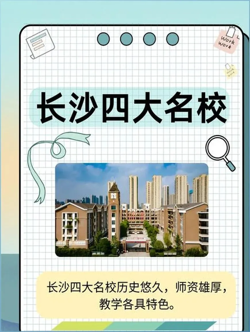 长沙四大名校分别是湖南师范大学附属中学、长沙市长郡中学、长沙市雅礼中学、长沙市第一中学,这四所学校都有超过百年的办学历史,在清末民初的新学运动中诞生,长期以来代表了湖南基础教育的最高水平。