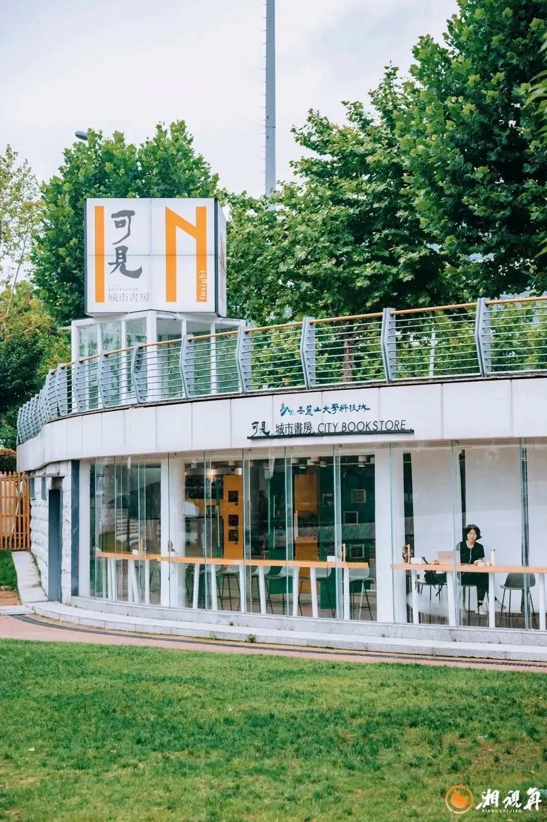 可见·城市书房坐落于后湖之畔,由一处原本闲置的下沉空间蜕变而来。数千册书籍沿着墙侧整齐排列,外侧则环绕着统一的弧形落地玻璃窗,光影通透。落座休憩时,读者还能发现座位下方贴心地配备了充电接口。