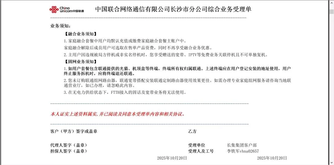 我之前做的公众号叫湘宽带,在3年前做那个公众号的初衷,就是我平常给客户推荐套餐的时候,一堆文字,但是发现客户好像都很难看完一大片的文字信息。因此,正好公众号可以图文并茂,一段文字还能配一个图片。以及文字可以不同颜色强调。 当客户需要了解一个宽带信息的时候,我们就发一些简单的套餐信息,和一个公众号,以便需要知道套餐更多细节的用户可以通过公众号长文了解更多。 但是,你成功的光芒是容易刺痛别人的眼睛的。像平台那么多规则,总有一条适合你。而我们这个行业需要在公众号发布宽带和手机卡有关的信息,按照规则是要有运营商的授权的。可我直接是运营商里的政企客户经理,问了公司,授权不能授权给单个人。因此就走流程,注册一个以代理商名义的签订合作协议,获取网络渠道授权二维码。 因此,我们每个文章下都需要放这个二维码的原因,并非是这个二维码能直接办业务,其实这个二维码是不能办业务的。而是代表在工信部可以查到这个渠道是经过运营商正规授权。其实说起来也无奈。我本就在长沙联通里上班的,有自己的cbss开户和联通政企,联通公众工号。 但是,有了这样的规定也好,毕竟我们是有熟人的,熟人给了我们营业执照授权,然后配合签订了联通合作协议并获取了运营商授权。而公众号上发布宽带和套餐信息就增加了门槛。其他人想做这些事就难度高多了,而且我们搞得早,后面管控更严了,后来的人就更难了。总经办〔2026〕1-7号》文件,用于落地监管新规、渠道与风控整改。1-7号文件常见模块(参考) 1号:渠道清理与权限回收核心:关停第三方非官方售卡(含直播/电商),ZOP平台下线,权限收至集团统一入口。注:我们不是第三方,为长沙联通政企客户经理。工号为集团客户部归属组。2号:跨省禁售与属地管控核心:线上仅售收货地所在省卡,激活地必须同省,禁止跨省开卡/异地激活。注:我们宣传的所有业务都不涉及跨省。大部分业务都不跨市。商务宽带和企业专线仅长沙本地,单宽带不跨省。跨省电路为固网,不涉及卡。3号:实人实名与核验强化核心:实人实证实卡、刷脸核验,一证五户,30天内同一运营商限申请1次,物联卡仅限企业(需营业执照+IMEI)。我们渠道为线上交流,但是业务完全转线下上门开通和交付,严格实名制。4号:套餐规范与资费治理核心:80G以上大流量套餐下架,统一公示39元50G、49元80G等主流套餐,清理低价恶性竞争。注:我们渠道开通的都是移固融合,跟宽带绑一起的卡。不会触碰这些恶性竞争。5号:ZOP下线善后与数据迁移核心:停止ZOP收单/销售,存量订单合规激活,数据迁移至官方系统,第三方结算收尾。注:自己工号线下渠道开通,不存在zop。数据全部经官方cbss系统和联通公众app,以及联通政企app。6号:风控升级与反诈拦截核心:强化骚扰/诈骗电话拦截,清理“养卡/黑卡”,异常开卡预警,责任到岗到人。注:所有移固融合都严格实名。营业执照入网的有合同+营业执照和个人证件双重实名。
