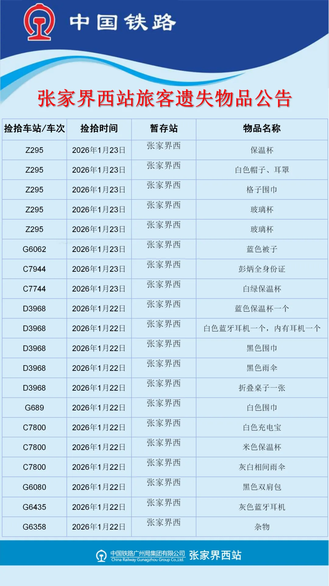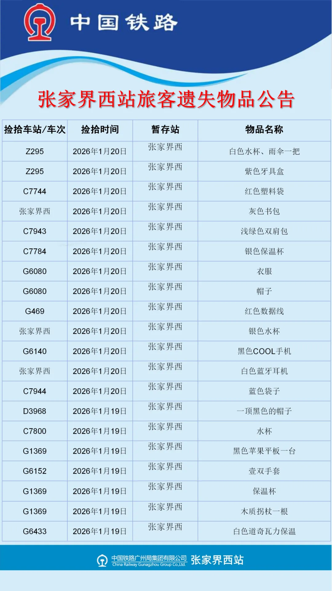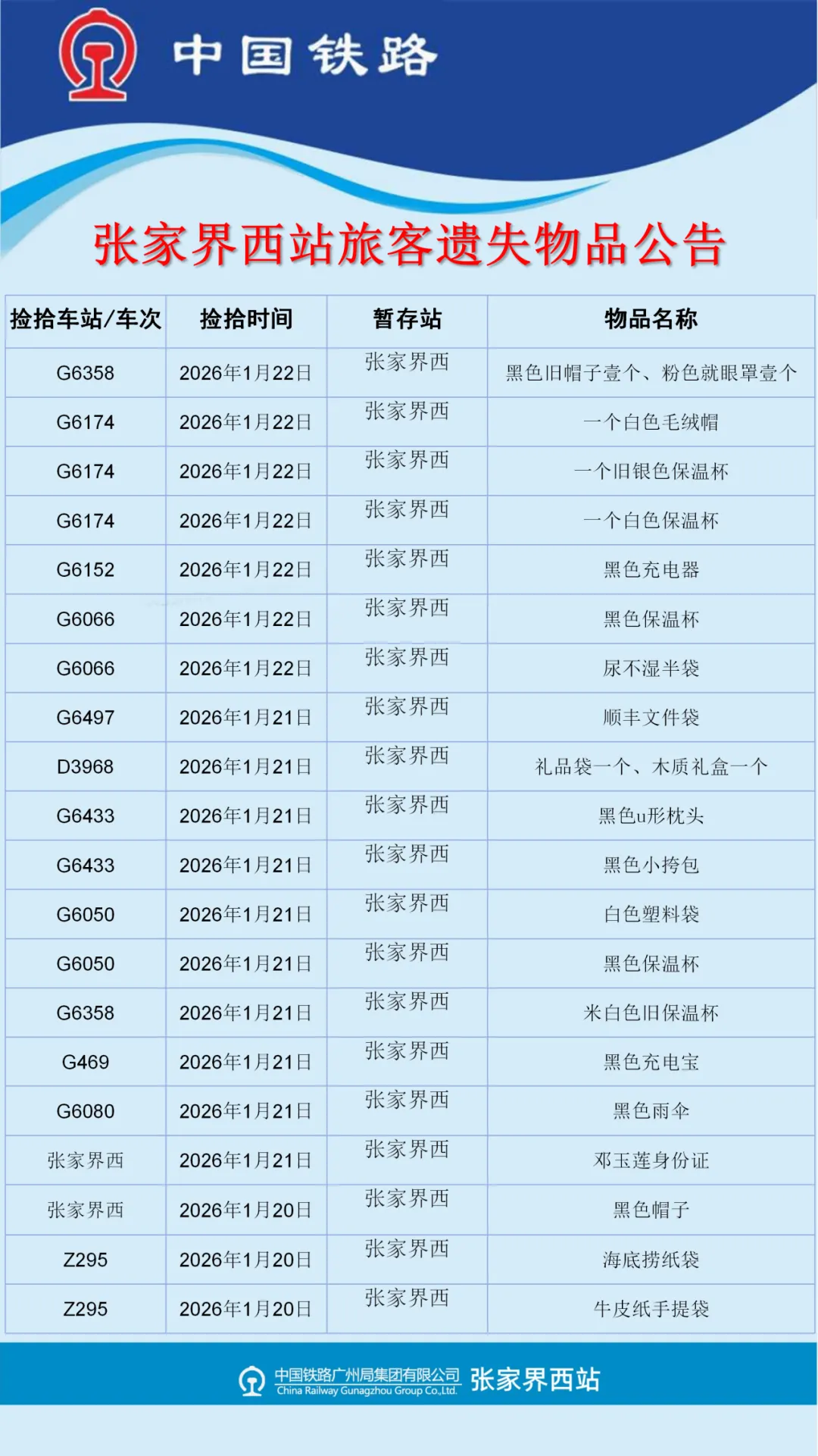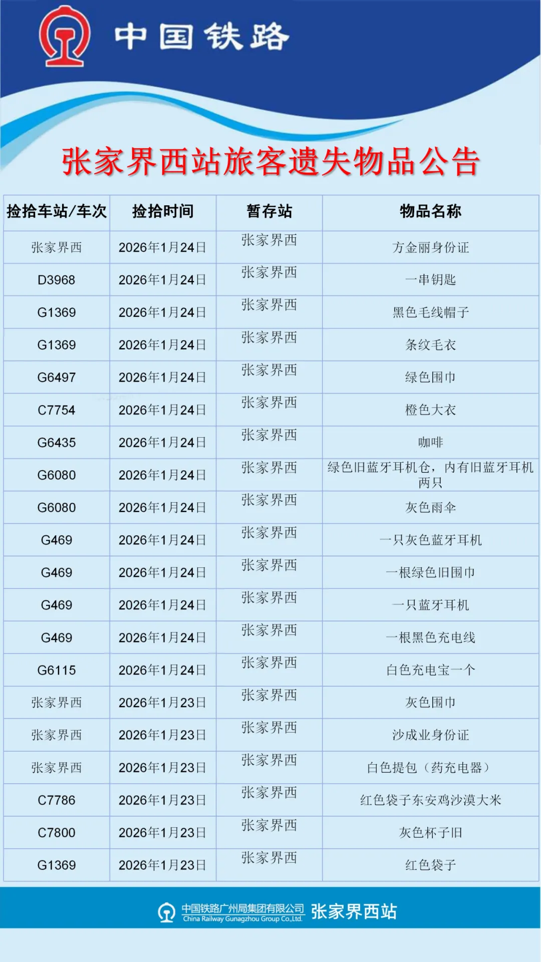 张家界西站失物招领公告(2026年1月19日-1月25日更新)