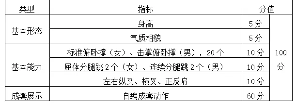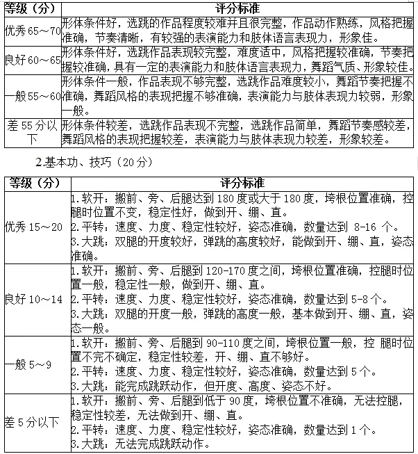 体育舞蹈测试内容及评分标准(总分100分,测试成绩低于70分不予录取)