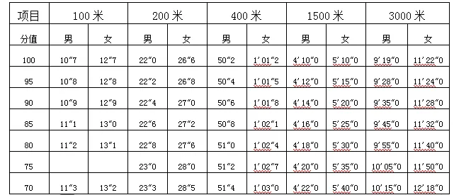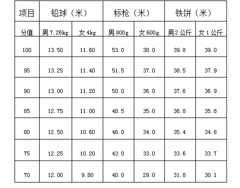 田径项目(总分100分,测试成绩低于70分不予录取)