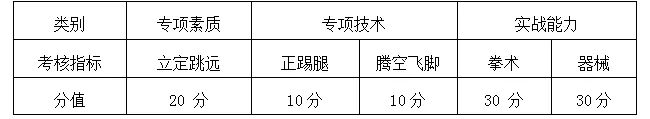 (1)考试方法:考生在下述规定拳种中任选一个拳种的拳术、器械进行测试,各占30分。