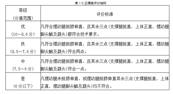 ②评分标准:考评员参照正踢腿评分细则(表1-2),独立对考生的技术完成情况进行评定。采用10分制打分,分数至多可到小数点后1位。
