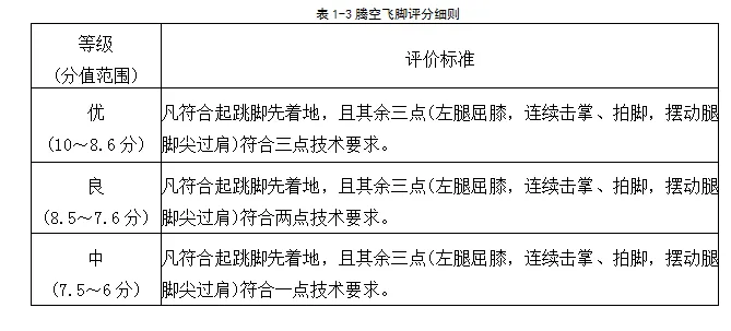 ②评分标准:考评员参照腾空飞脚评分细则(表1-3),独立对考生的技术完成情况进行评定。采用10分制打分,分数至多可到小数点后1位。