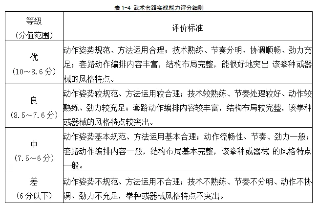 (4)评分标准:考评员参照实战能力评分细则(表1-4),独立对考生的动作质量和演练水平进行综合评定。采用10分制打分,分数至多可到小数点后1位。