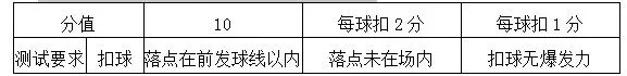 评分标准:落点在前发球线以内为满分;落点在距前发球线50厘米内每球扣0.5分;落点距前发球线50厘米以外每球扣0.5-1分。