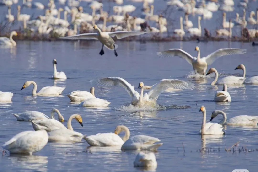 东古湖观鸟胜地:每年冬季,超万只西伯利亚小天鹅会跨越千里来此越冬,此外,还有白鹤、豆雁等57种珍稀鸟类在此栖息,构成了冬日里一道独特的风景线。天鹅归巢的场景尤为壮观。