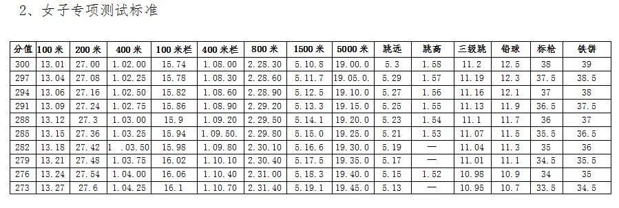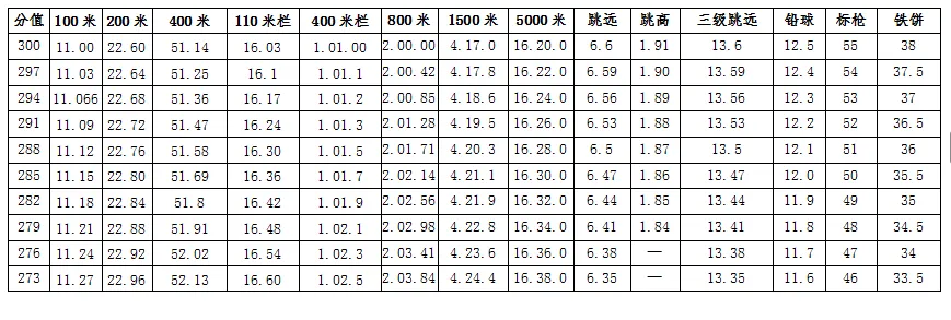 注:800m成绩4'34" 50m成绩10"3以后者记0分。