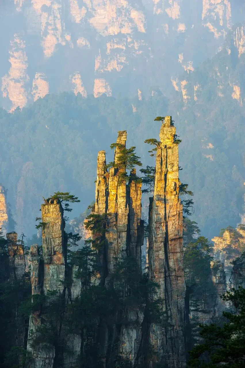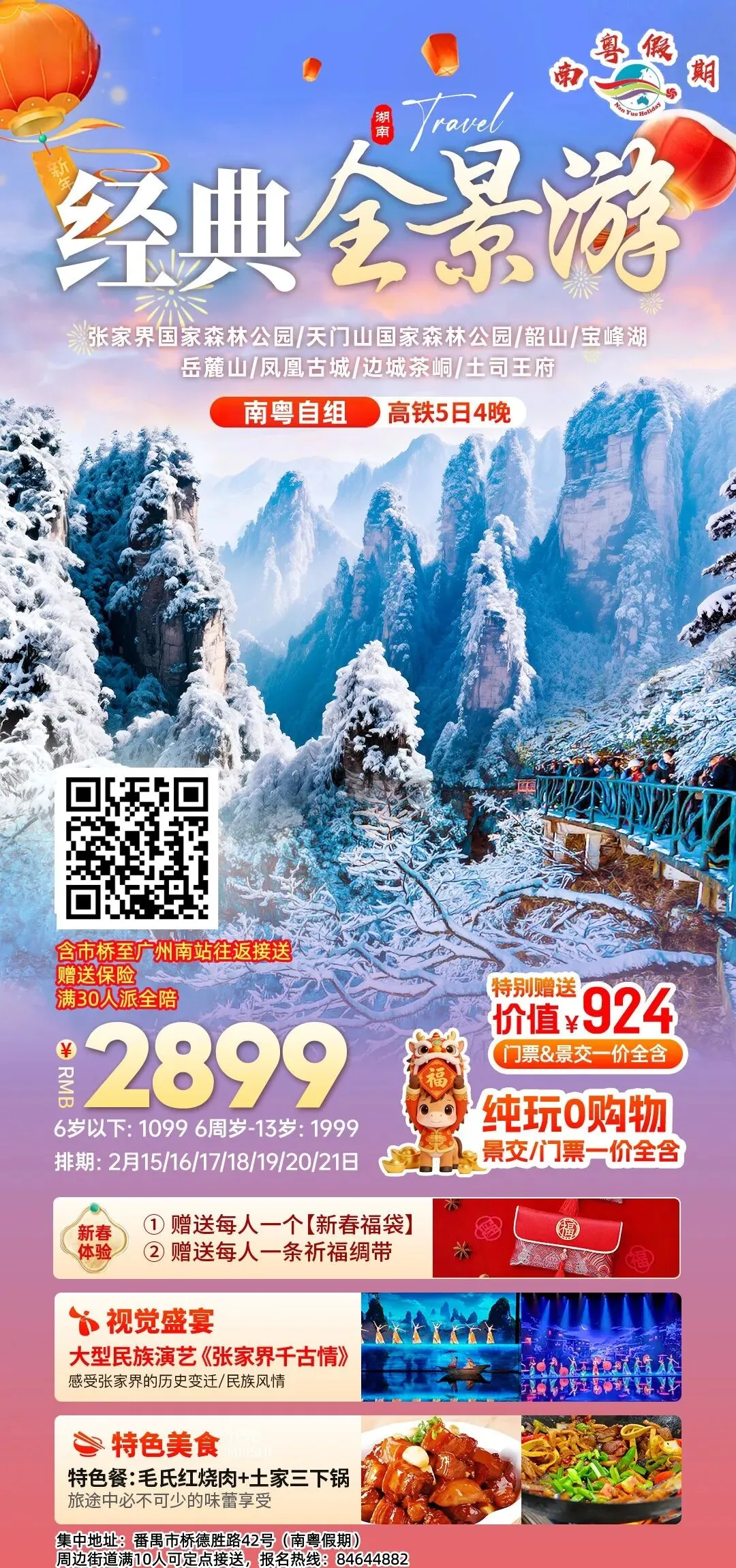 第3天:张家界国家森林公园 ·宝峰湖《张家界千古情》表演前往【张家界国家森林公园】(含景区环保车),张家界国家森林公园面积130平方公 里,是中国第一个国家森林公园。其处于峰林演化史的青年期,地貌奇特,石峰林立,形态 各异,树木茂盛;四周山地环抱,坡陡沟深,气候暖湿,景点众多。首先前往游览【天子山景区】(游览时间约1.5小时,尊享森林公园优先通道,专车上天 子山VIP通道),天子山素有峰林之王美称的天子山,她的神奇,在于烟云缭绕的奇石危峰, 如柱、如塔、如笋,低者数十米,高者数百米,雕镂百态。有屈子行吟,有姐妹私语,有夫 妻情深,有众仙聚会、群娥起舞,有天兵出征等天然群像。主要游览:御笔峰、仙女散花、 贺龙公园、天子阁、贺龙铜像、西海峰林等。天子山有四大奇观:峰林、云海、日出、冬雪。一幅幅雄伟壮观、奇特迷人的景象,相信会让大家大饱眼福而流连忘返。后前往世界自然遗产的核心【袁家界】(游览时间约1.5小时,含百龙天梯单程), 后 乘 【百龙天梯】索道站乘全暴露观光缆车 ·最高户外电梯 ·体验66秒直达山顶、挑战你的心速! 一览春日风光!袁家界位于杉刀沟北麓,是以石英岩为主构成的一座巨大而较平缓的山岳, 既有石丛小涧、银瀑高泻,又有竹林繁茂、苍松垂壁。水丰林密,空气极为清新,是张家界 公园一处风景集中地,主要游览:天下第一桥、迷魂台、哈利路亚山(电影《阿凡达》中 “悬浮山”的取景山)后花园等。前往【金鞭溪】(游览时间约1小时) 因途经张家界十大绝景之一—神鹰护鞭的金鞭岩而 得名。金鞭溪沿线是武陵源风景最美的地界,从张家界森林公园门口进入后,往前步行300 米左右就是金鞭溪的入口。穿行在峰峦幽谷间,溪水明净,跌宕多姿,小鱼游弋其中。溪畔 花草鲜美,鸟鸣莺啼,人沿清溪行,胜似画中游。被誉为“世界上最美丽的峡谷之一。”☆☆温馨提示☆☆:①张家界国家森林公园景区严格执行实名制购票,提前3天预约门票,分时段入园,请务必核对姓名、身份证号。一经预约成功,不退不改,门票损失自行承担,出游时必须携带身份证原件!②张家界国家森林公园景区内小景点游览顺序,根据当日景区人流量可能会有所调整,请你需知!