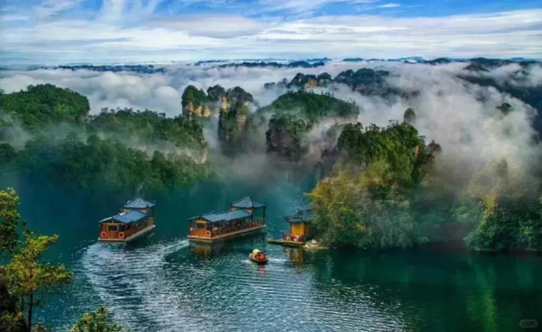 前往游览【宝峰湖】(游览时间约1.5小时,含环保车及游船),宝峰湖是一座罕见的高 峡平湖,四面青山,一泓碧水,风光旖旎,是武陵源风景名胜中的精品景点,被称为张家界 之魂。景区内自然原始,古朴天然,植被茂盛,地貌奇妙,保护良好,是潇湘山水的集大成 者,也是中外游客观光、休闲、度假的旅游胜地。四周群山环抱,奇峰罗列,如天然的屏障 将这片人间胜境温柔守护。湖水碧绿如玉,澄澈透明,在阳光的轻抚下,波光粼粼,似无数 颗细碎的钻石洒落在湖面。晚上游览《张家界千古情景区》(含景区游乐项目[除情人海游船+水上飞人外]及表演价 值158元/人,此为赠送项目,不去不退),由世界演艺第一的宋城演艺倾力打造,再现了大 庸古国万年的历史文化与民族风情,老少同乐,晴雨皆宜。大庸古街内非物质文化遗产和手 工作坊云集,可近距离体验非遗文化的魅力。陶源秘境内赶尸鬼屋、蚩尤呼风唤雨风暴馆等 高科技体验项目惊喜连连。烂苹果亲子乐园拥有丛林大冒险、旋转木马、淘气堡、碰碰车等 数十项亲子游乐以及清明上河图电影馆,全家一起嗨。【张家界千古情风情歌舞演艺】:浓缩了张家界亿万年的历史文化与传奇,分为《沧海桑田》《武陵仙境》《天子山传奇》《小城往 事》《马桑树下》等场,数百位演员倾情演绎,万余台舞台机械上天入地,视觉盛宴,心灵 震 撼 。☆☆温馨提示☆☆:此为赠送项目,如遇景区提质改造或不可抗力因素造成无法正常演出以及个人原因取消等,赠送项目,不游不退。
