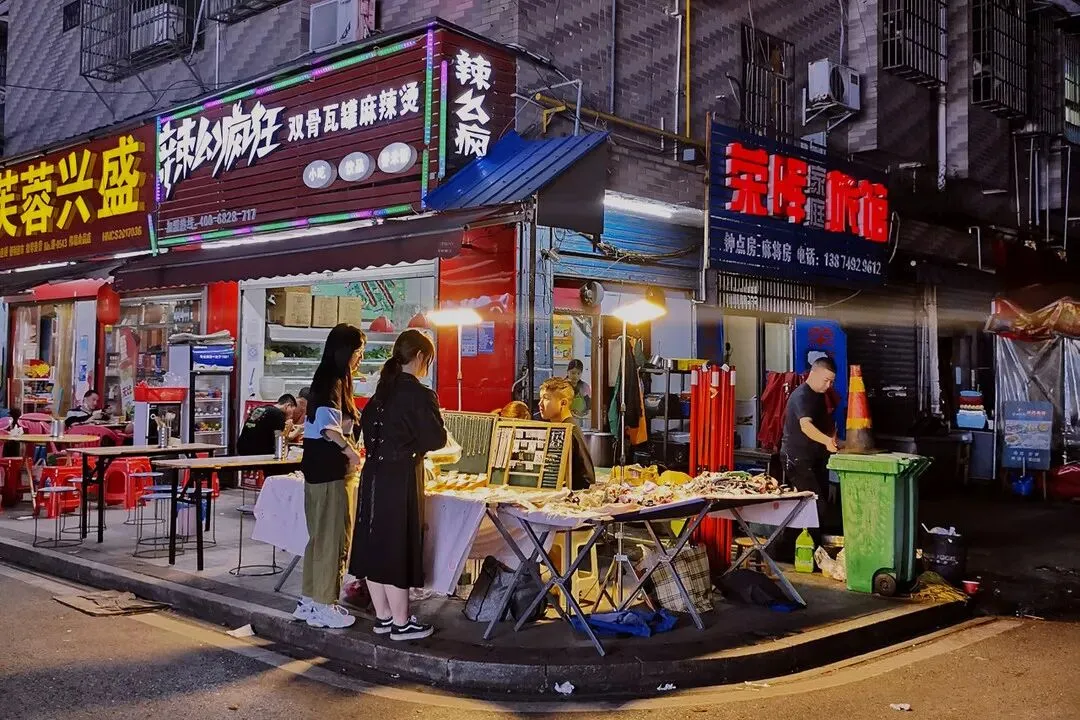 长沙城东五一新村夜宵街,这里白天冷清,一到夜晚,门庭若市,人声鼎沸,烟火气息非常浓厚。