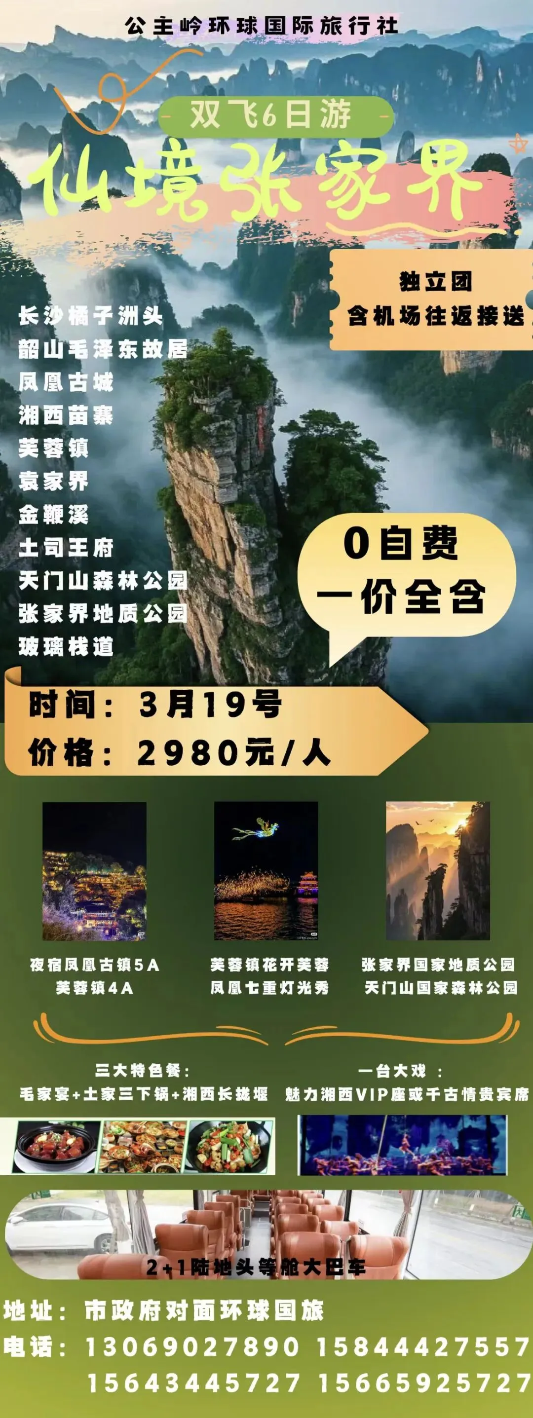 公主岭环球国际旅行社重磅推出张家界双飞6日游,3月19日准时启航,带你深入湘西秘境,解锁张家界的奇山异水、凤凰古城的温婉柔情,还有独家升级的豪华体验,全程无忧畅玩!