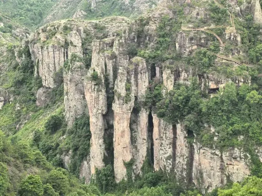 车到山顶,沿着指示牌走到观景台,山脚的村庄和田野一览无余。小张家界其实叫紫凝山,位于天台县城西南约20公里处,相传佛教天台宗创始人智者大师在此诵经时感紫云之异而得名。千丈岩,是紫凝山张家井村北面深壑的统称,深壑东面山崖千仞壁立,怪石嵯峨,数十支高逾百米的大石笋凌空屹立,高耸入云。佛手岩,状如五指直立,粗逾数丈。双梦笔,尖端天然开花,状类黄山梦笔生花。由此可见,小张家界并非空有虚名。