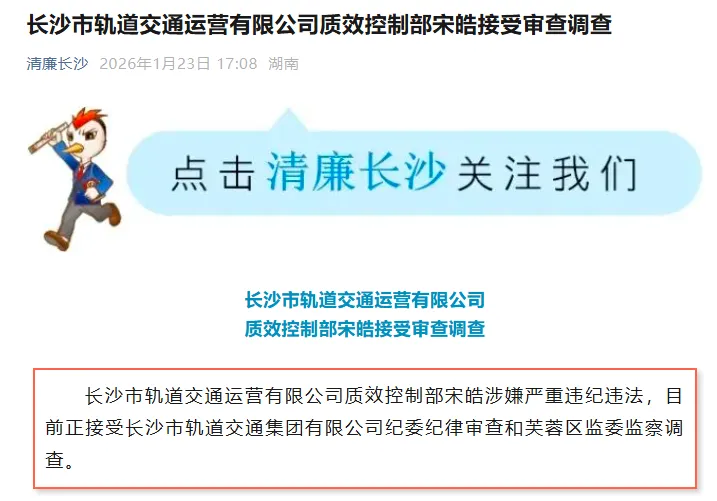 ”1月23日消息:长沙市轨道交通运营有限公司质效控制部宋皓涉嫌严重违纪违法,目前正接受长沙市轨道交通集团有限公司纪委纪律审查和芙蓉区监委监察调查!