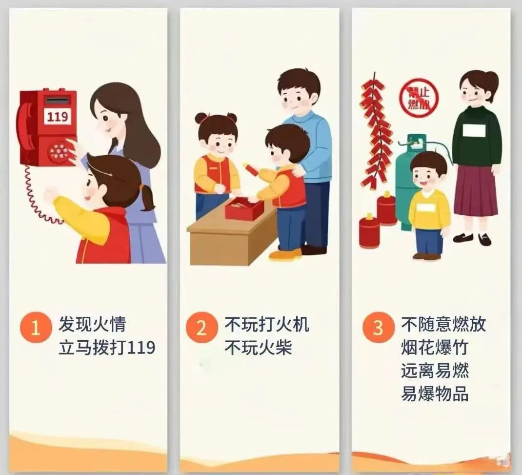 家长教育孩子要牢记火警号码119,将打火机、火柴等火种收好,严禁孩子随意燃放烟花爆竹,远离易燃易爆物品。