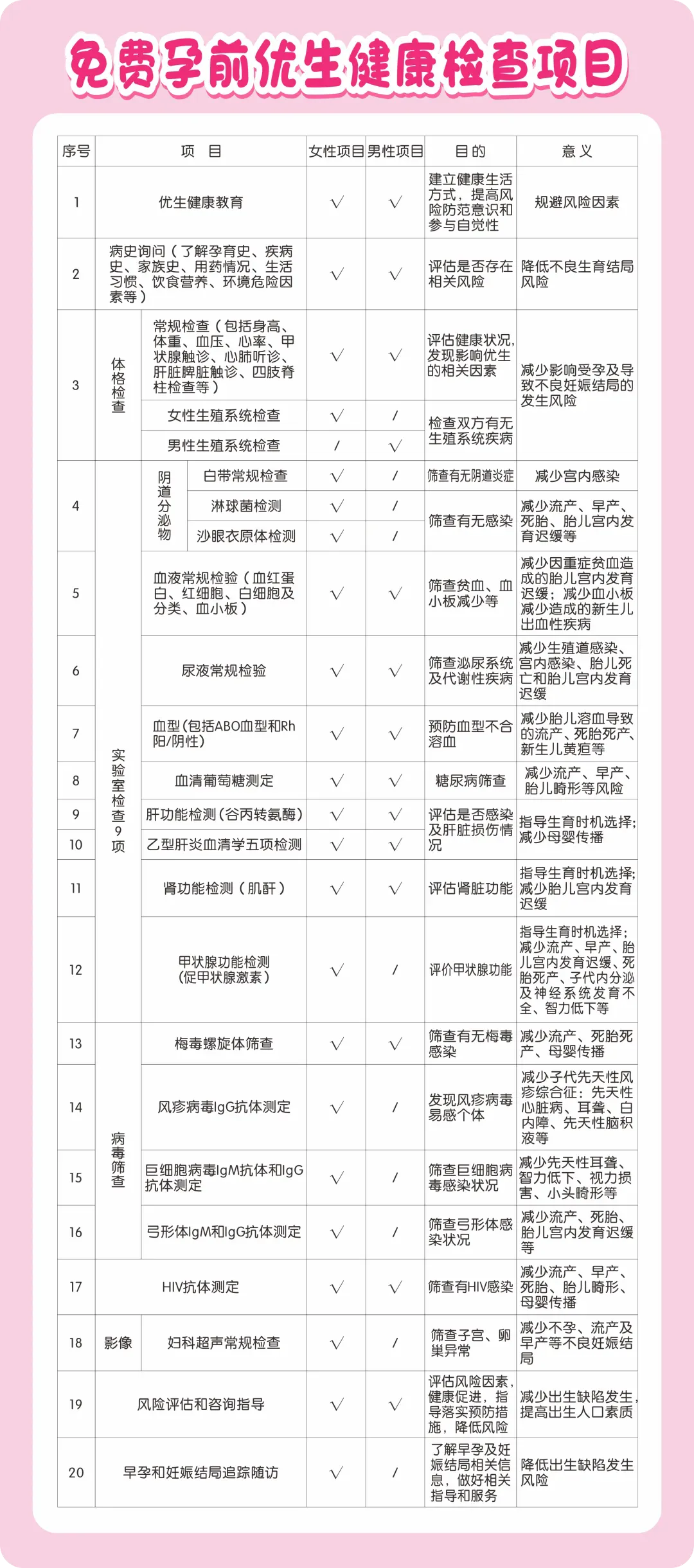 4️⃣免费孕前优生健康检查项: