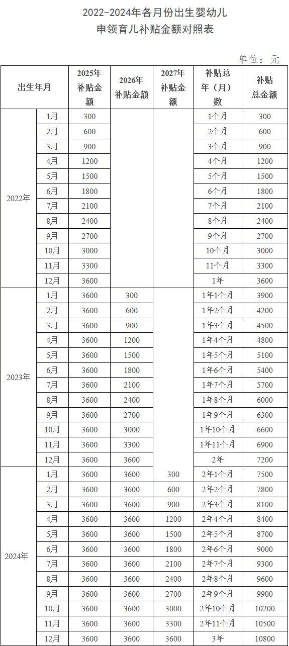 ❶ 对于2025年1月1日及以后出生的婴幼儿,可连续申领3年补贴,共计10800元。
