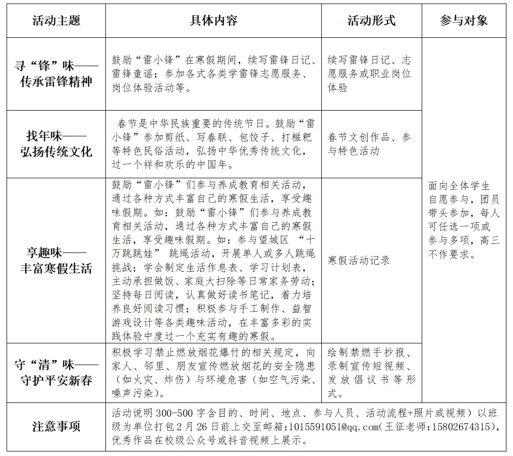 1.全校“雷小锋”可以自愿选择参与一项实践活动,参与活动的过程材料(活动说明300-500字含目的、时间、地点、参与人员、活动流程+照片或视频)以班级为单位打包2月26日前上交至邮箱:1015591051@qq.com(王征老师:15802674315),优秀作品在校级公众号或抖音视频上展示。
