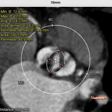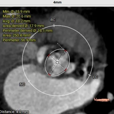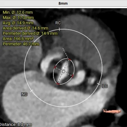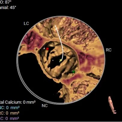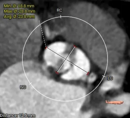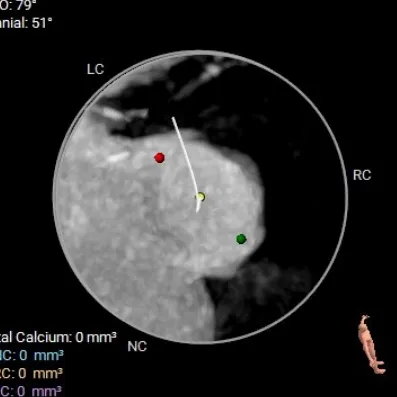 术前CT评估:TYPE 0型二叶瓣,瓣叶肥厚,前后交界粘连,瓣叶无明显钙化,双冠异窦,左冠开口高度约16.6mm,右冠开口高度约16.7mm。法式窦结构小,STJ高度约21.6mm,直径约24.4mm,升主动脉未见明显增宽,心脏角度约42°,左室大小尚可,心尖部可见局部心肌薄弱。